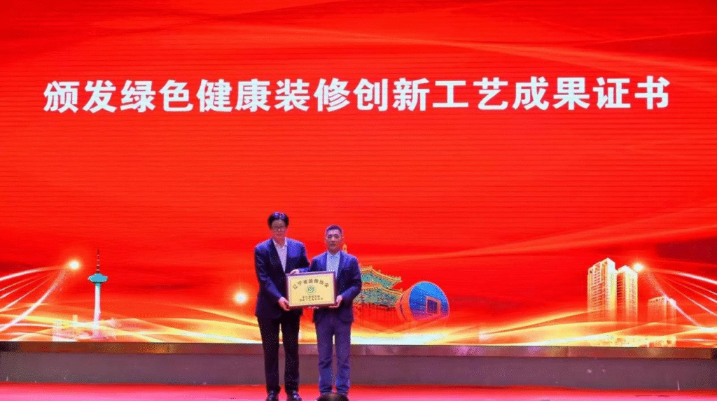 活动现场,辽宁省装饰协会会长刘兴贵为辽宁省装饰协会副会长单位一号氧吧(辽宁)生态环境科技有限公司颁发了“绿色健康装修创新工艺成果证书”,该证书是行业创新的缩影,既代表当前工艺技术最高水准,,更彰显了行业对科技进步与品质提升的执着追求,必将引领未来人居建设向更绿色、更健康的方向持续迈进。